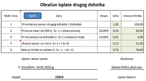 generira ispravu Obračun isplate drugog